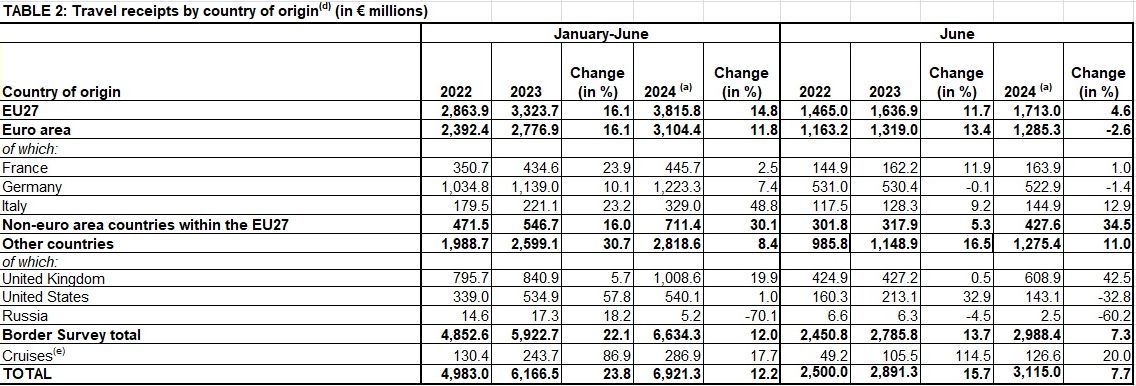 In contrast, receipts from the United Kingdom rose by 19.9% to just over €1 billion, and those from the United States increased by 1.0% to €540.1 million. However, receipts from Russia plummeted by 70.1% to €5.2 million.