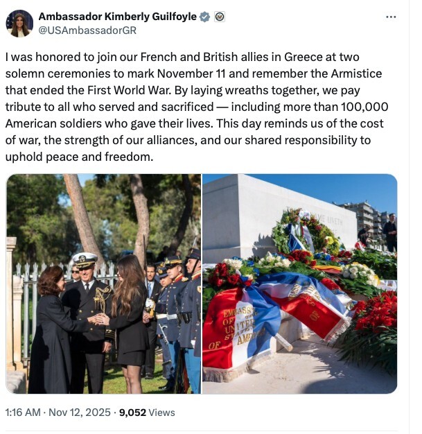 U.S. Ambassador to Greece Kimberly Guilfoyle joined French and British counterparts in Athens for two solemn ceremonies commemorating Armistice Day on November 11. The events honored the anniversary of the end of the First World War and paid tribute to those who served and sacrificed their lives.