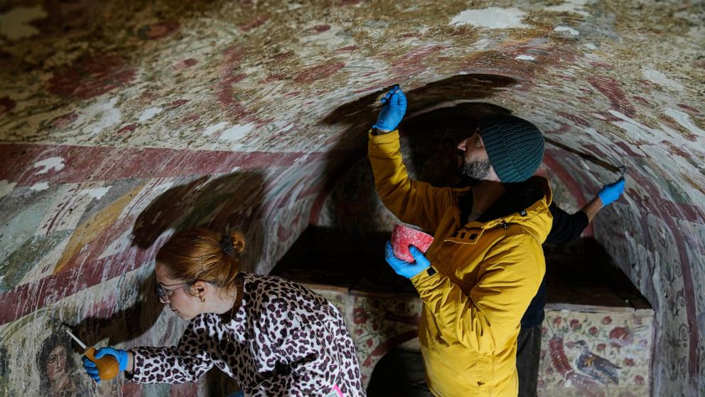 "Archaeologists restoring the frescoes inside the underground tomb near İznik,