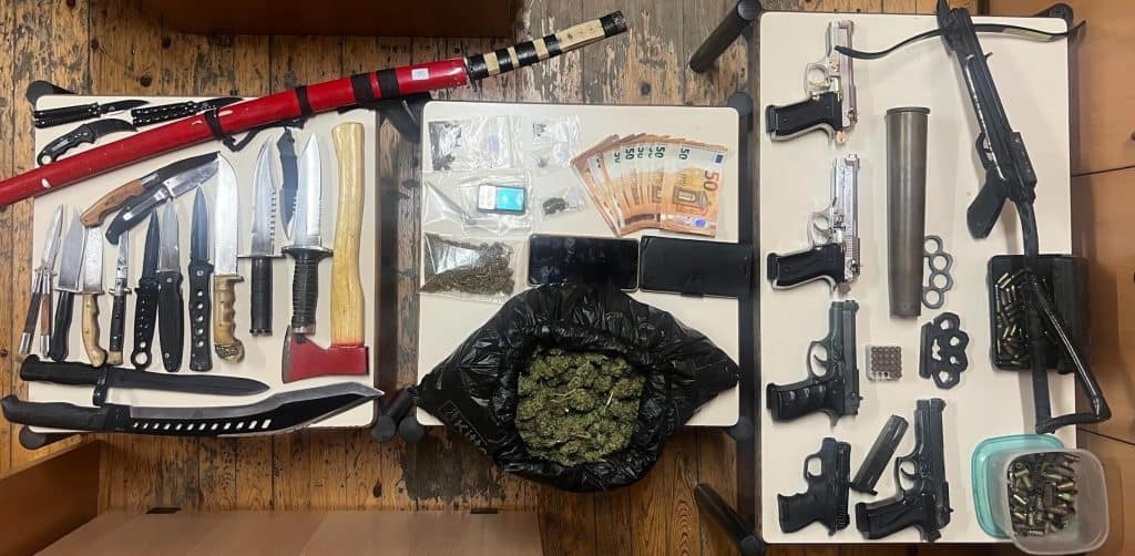 Subsequent searches of the suspects’ residences in the Heraklion area, carried out with the support of Rethymno’s Narcotics Division, uncovered an extensive cache of weapons and drugs. Seized items included: