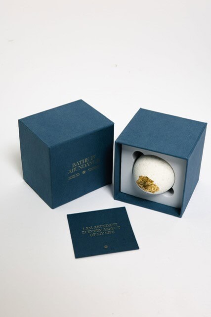 Her most recent creation, Bathe in Abundance, encapsulates this fusion. Inspired by her nightly self-care ritual of oil-infused Epsom salt baths, crystals, and meditation, she created a sacred bath bomb infused with frankincense, myrrh, and gold: the three gifts offered to Christ.