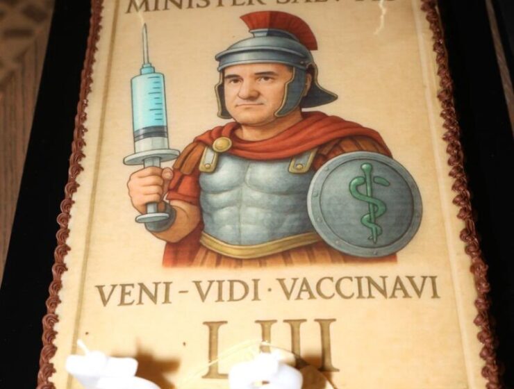 Greek Health Minister Adonis Georgiadis sparked outrage with a birthday cake reading “Veni, Vidi, Vaccinavi,” seen as insensitive amid medicine shortages and rising healthcare costs.