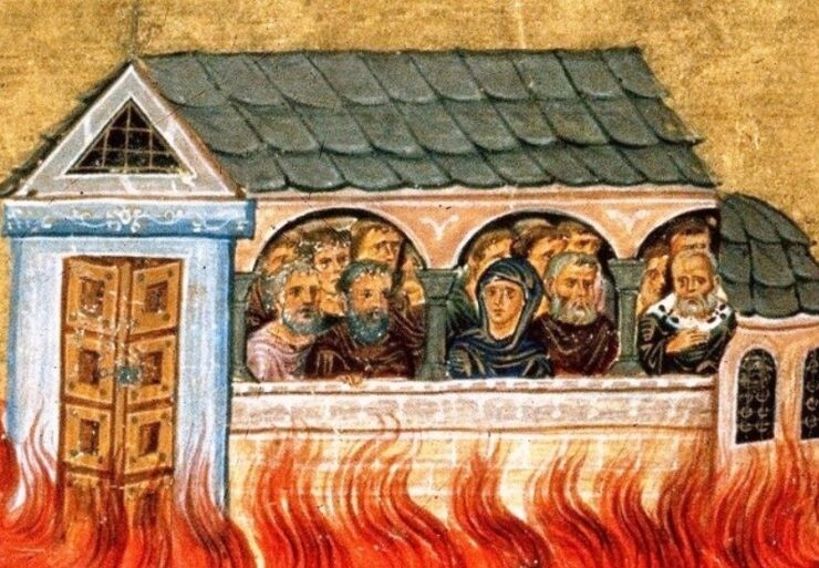The Holy 20,000 Martyrs of Nicomedia: At the beginning of the fourth century the emperor Maximian (284-305) gave orders to destroy Christian churches, to burn service books, and to deprive all Christians of rights and privileges of citizenship. At this time the bishop of the city of Nicomedia was Saint Cyril, who by his preaching and life contributed to the spread of Christianity, so that many members of the emperor’s court were also secret Christians.