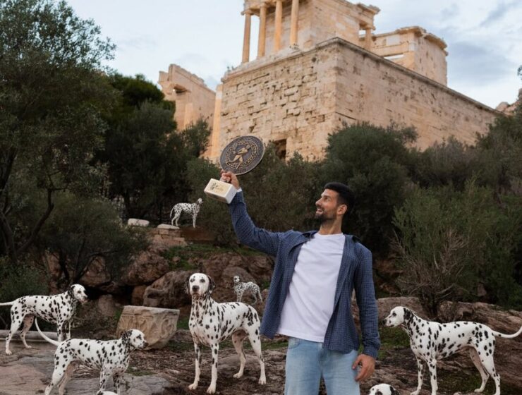 Novak Djokovic celebrated his 101st ATP title in Athens with Dalmatian dogs and the iconic Propylaea, playfully nodding to 101 Dalmatians while standing before ancient Greek glory.